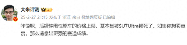 知名数码博主大米评测说,小米SU7 Ultra这款车已经给纯电性能车的价格定了个上限。如果其他品牌想卖得更贵,就必须在赛道上拿出更好的表现,证明自己的车更强。